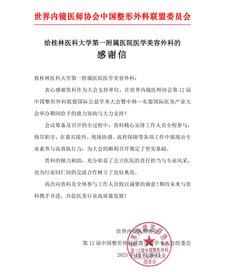 作为大会的核心支持单位,桂林医科大学第一附属医院医学美容外科凭借其深厚的学科积淀、强劲的技术实力与专业的服务能力,全程深度参与大会筹备与举办的各项关键环节,成为大会成功举办的“中坚力量”,其卓越贡献得到了大会组委会的高度认可与诚挚感谢。