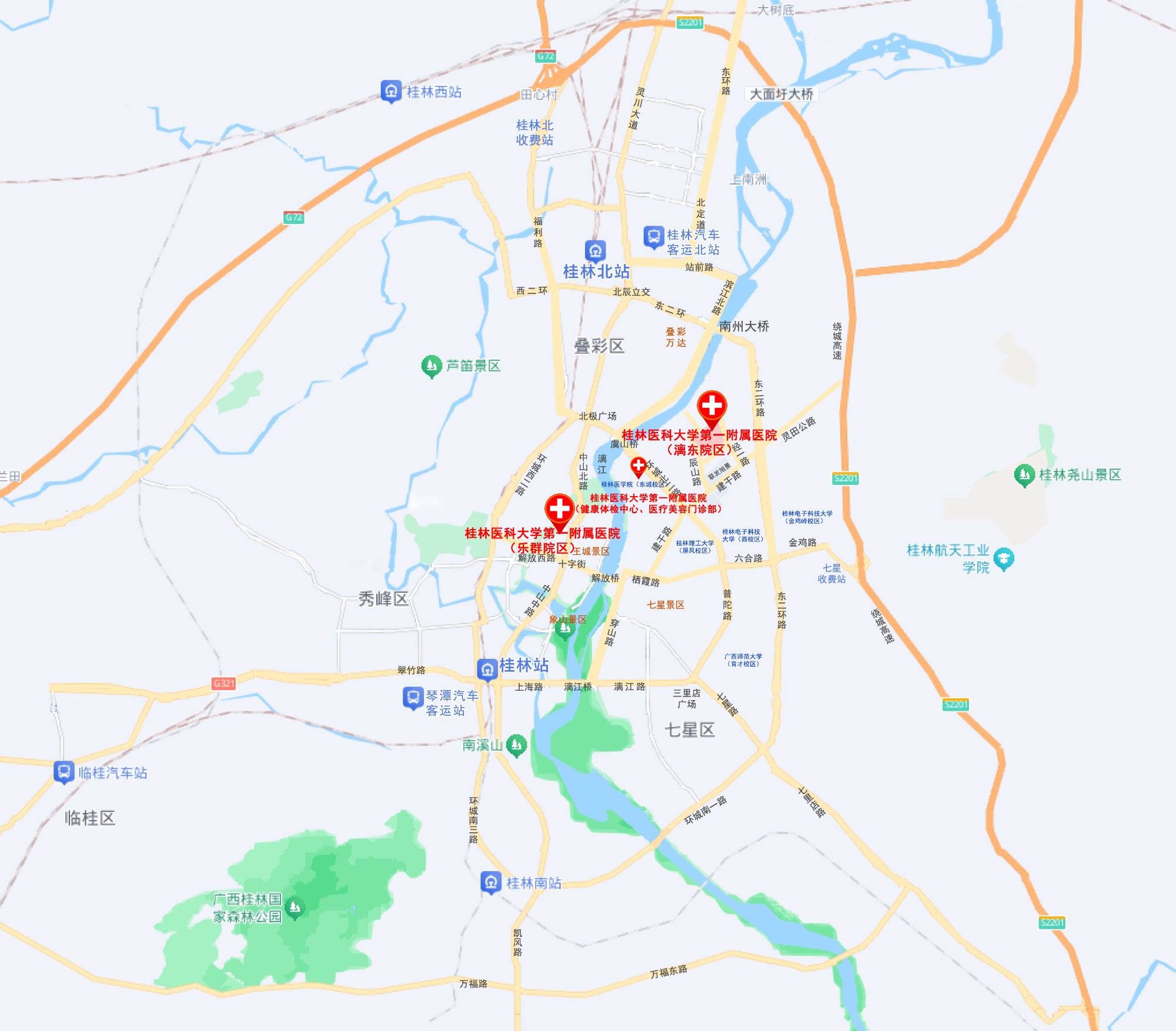 桂林汽车客运北站→乐群院区6公里,漓东院区 7公里