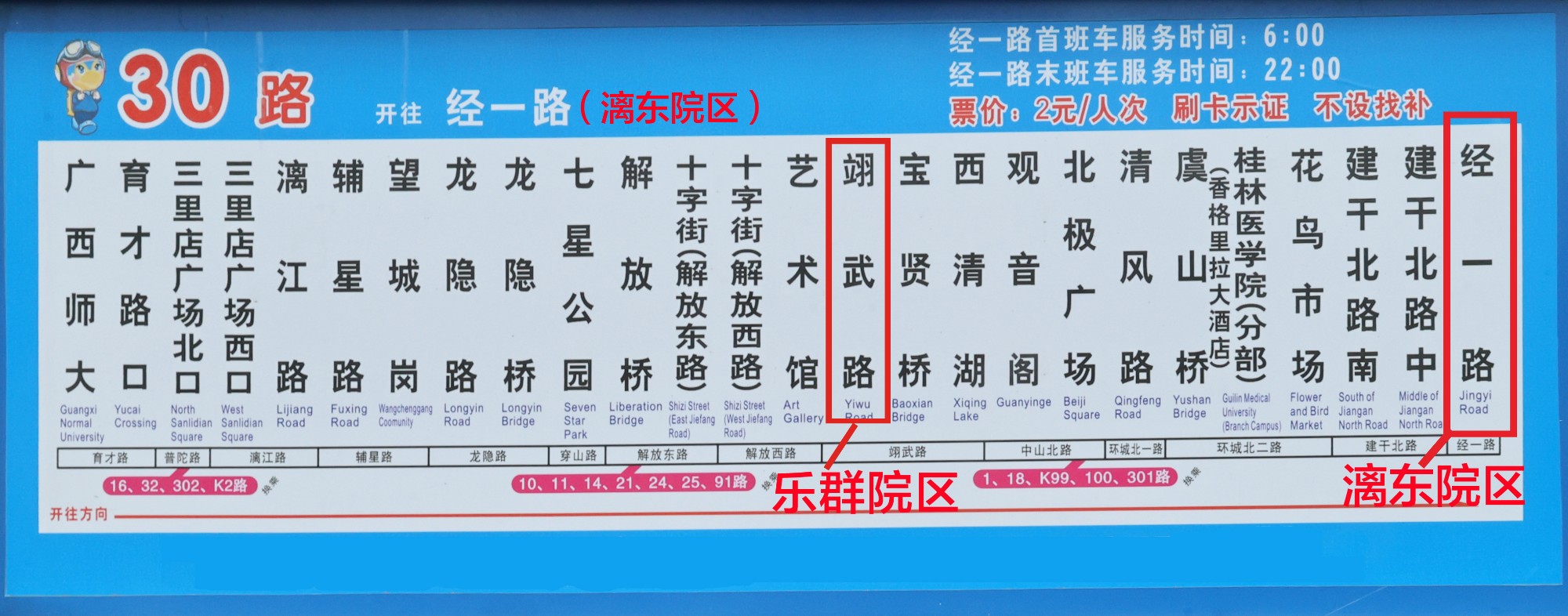 乘坐30路公交可直达漓东院区(经一路);