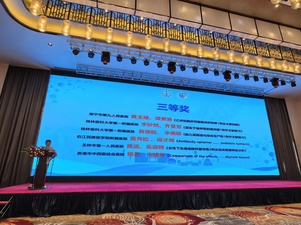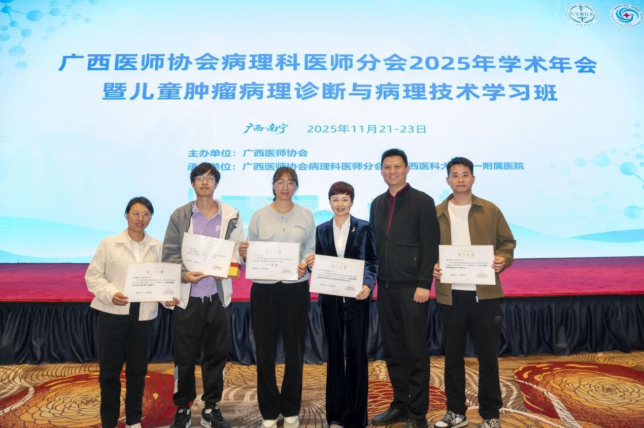 近日,广西医师协会病理科医师分会2025年学术年会暨儿童肿瘤病理诊断与病理技术学习班在南宁召开。本次会议汇聚了全区及部分外省地区病理学界精英,围绕病理诊断、技术创新、教学研究等领域展开深度交流。会议期间举行了病理技术知识竞赛,同时公布了学术年会征文比赛,我院病理科团队凭借扎实的专业功底和创新能力,在竞赛中脱颖而出,共斩获两项一等奖、一项二等奖及两项三等奖,展现了科室在全区病理学界优势地位与综合实力。